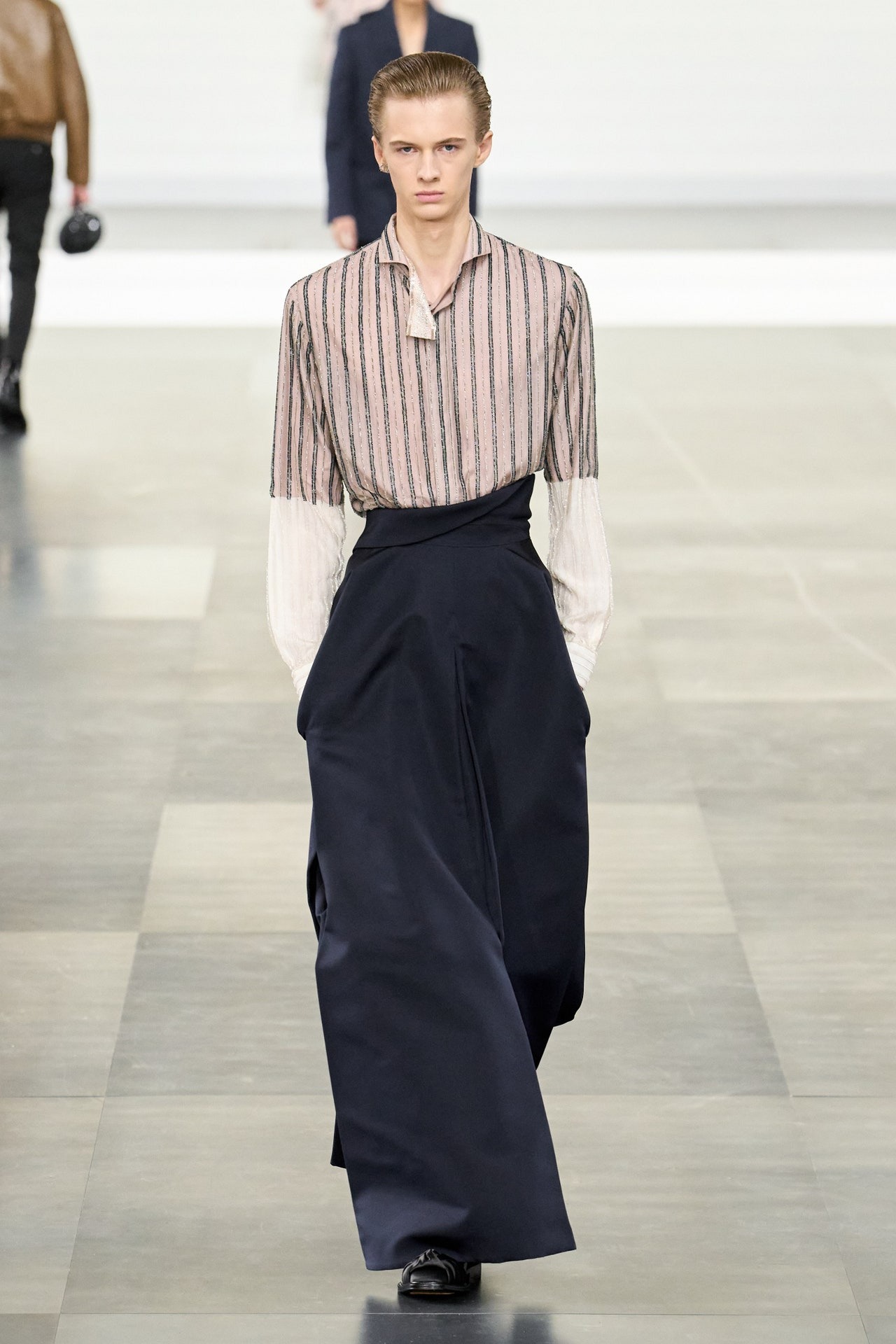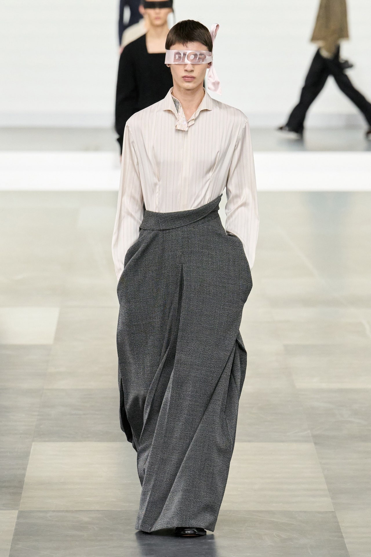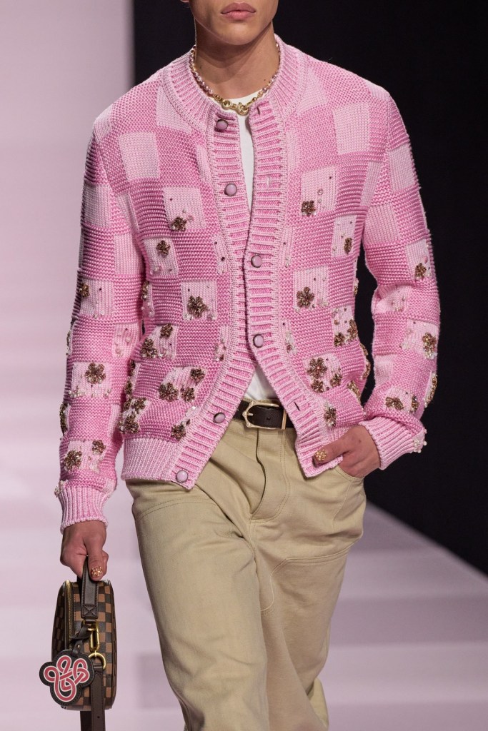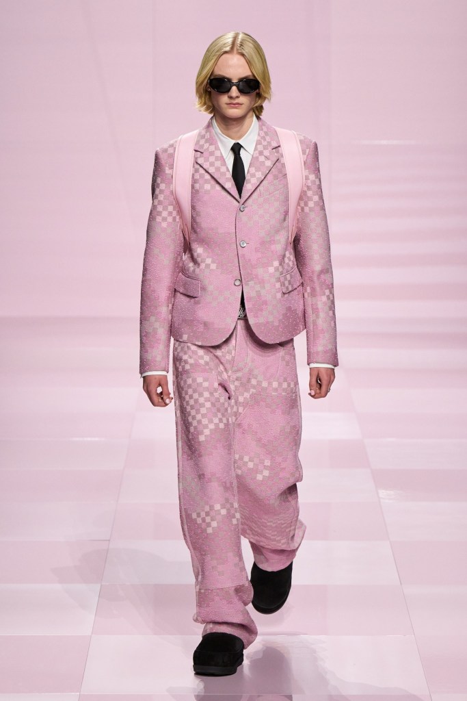 ღია ვარდისფერი ასევე აქტუალური იყო Dior-ის ჩვენებაზეც. მოდის სახლის ხელწერა “H-Line” სილუეტებით მაღალი მოდიდის არქივებიდან, მამაკაცის 2025 წლის შემოდგომა/ზამთრის კოლექციაში პოულობს ადგილს.